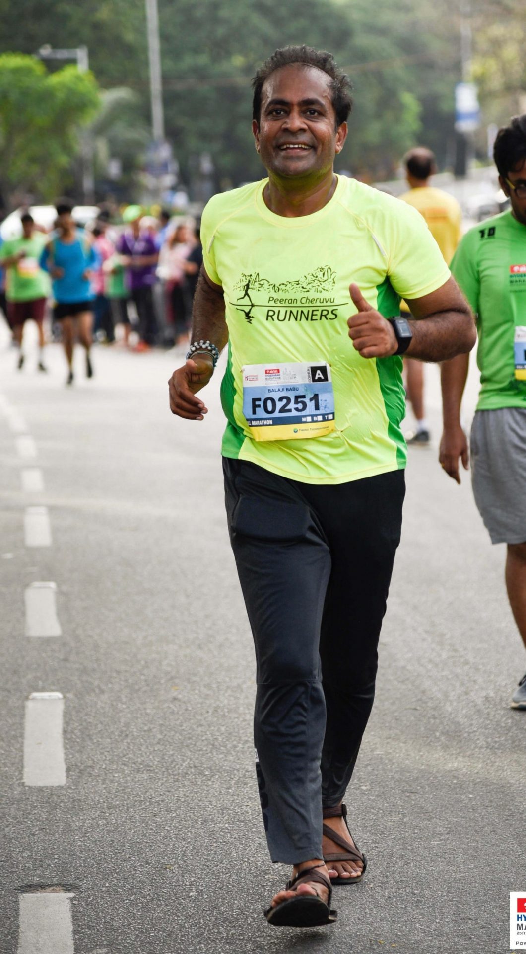 I have started my running journey at the age of 40 years. When I was struggling in the initial days, I met a few runners from the running community (Peeran Cheruvu Runners) and with their support I could gather confidence of doing a half marathon. With structured training and motivation from the fellow runners, I could complete a few half marathons.